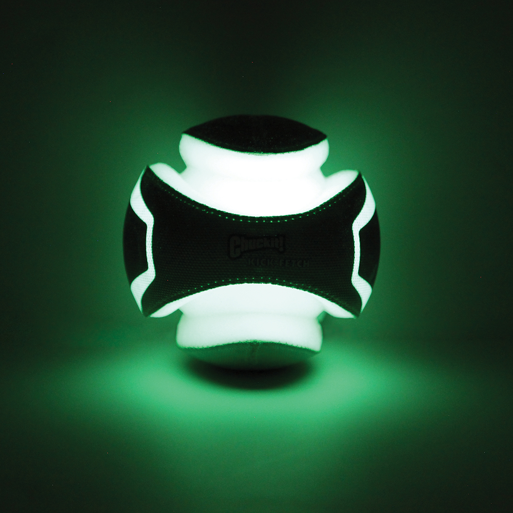 Made with safe photoluminescent material which is chemically and biologically inert, the Max Glow Balls and Kick Fetch charge quickly under any bright light taking just 5 minutes to generate 20 to 30 minutes of high-visibility playtime – no batteries or cords needed. It allows engaging playtime on land and water, while being gentle on teeth.
