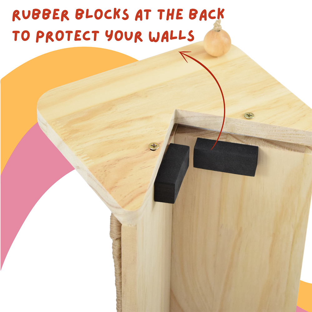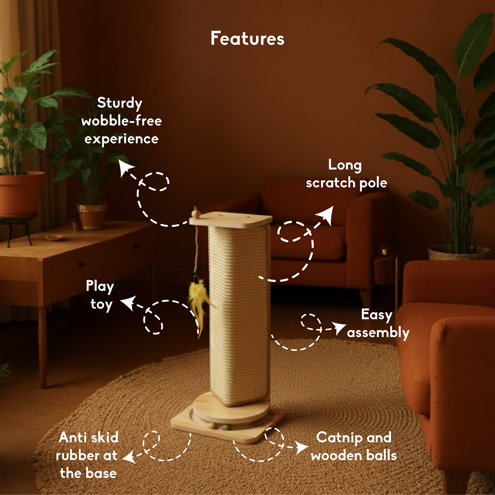 Transform your cat’s playtime with this sleek and functional wall-mounted cat scratcher, specially designed for wall edges and corners. Made for cat owners who love a clean, stylish home, this space-saving cat scratching post is the perfect alternative to bulky floor scratchers. Made with wood, this vertical scratcher adds a modern aesthetic while standing up to even the most enthusiastic scratchers. The sturdy sisal wrap provides a satisfying texture for cats to sharpen claws, stretch, and relieve stress – while sparing your furniture from damage. What makes this scratcher unique? It’s not just a post – it’s a multi-functional activity center. The top-mounted feather toy adds excitement, while the base track ball game keeps curious cats engaged. Whether they love to climb, play, or scratch, this corner cat scratching board gives them everything in one compact unit. Key Features• Wall Corner Mount Design – Space Saver for Small Homes- Maximize floor space with this vertical cat scratching post for wall corners. Perfect for small spaces, apartments, and modern homes• Natural Wood Finish – Stylish & Durable- Crafted from eco-friendly wood with a smooth, minimalist look. This aesthetic cat scratcher blends seamlessly with your home decor while offering long-lasting durability.• Heavy-Duty Sisal for Healthy Claws- The scratcher features a tightly woven sisal scratching surface that satisfies your cat’s scratching instincts while keeping claws healthy. Protects furniture from unwanted scratching.• Vertical Design for Full-Body Stretching- Perfect for cats that prefer tall vertical scratchers. Encourages full-body stretch, healthy posture, and muscle activity. Great for multi-cat households too!Interactive Play Design• Includes a dangling feather toy and a base ball track to keep your cat mentally and physically stimulated. Promotes active play and reduces boredom.• Easy to Mount – Secure Fit- Simple to install with included hardware. Designed for 90° wall corners, with rubber spacers and secure clamps for a tight, stable fit. Quick assembly, no wobble.Product DetailsDimensions (cm): 58.5L x 27W x 21.5HDimensions (inches): 23L x 10.6W x 8.5HMaterials: Engineered wood, sisal Assembly: Assembly required. Instructions provided.Net weight: 2 KgOur products are handcrafted by artisans using high quality raw materials. The natural characteristics of these materials especially wood may cause slight variations in colour, texture, tone and shape. This is normal and makes your furniture unique.Care Instructions• Strictly intended for Indoor use• Wipe clean with damp cloth; dry immediately• Avoid exposure to direct heat or sunlight.• Avoid strong cleaning products.