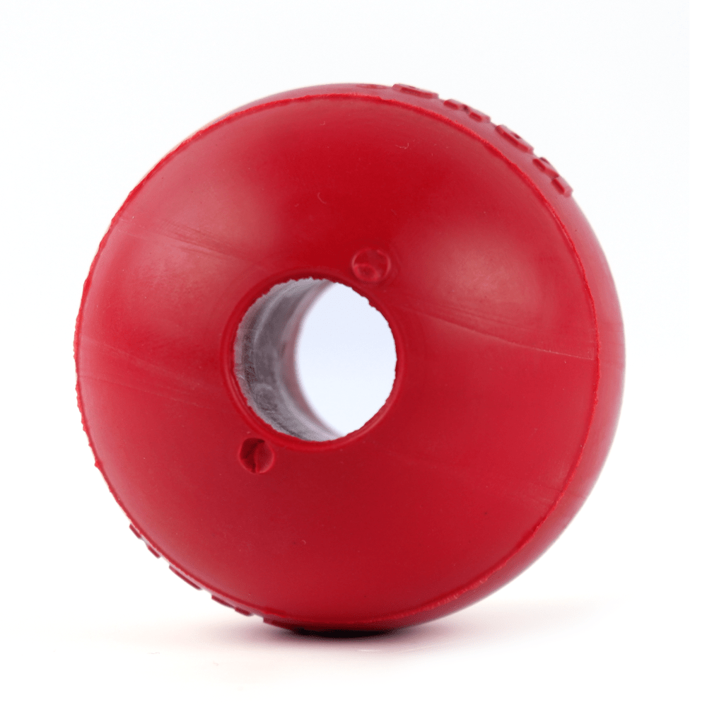 Description: A durable, red rubber dog toy with a built-in hole that makes playtime more fun and engaging. Made from tough, non-toxic KONG Classic rubber, this ball is designed to withstand chewing and bouncing during games of fetch and interactive play, making it suitable for medium to aggressive chewers. Its unpredictable bounce and treat-stuffable hole help keep dogs physically active and mentally stimulated.