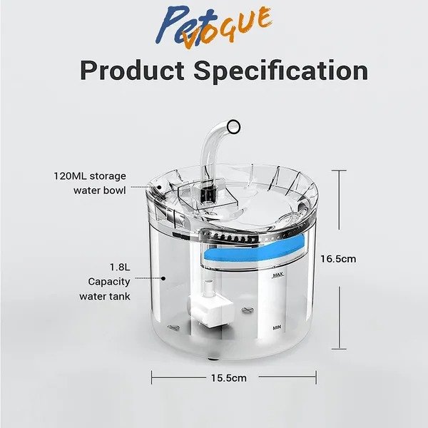 Hydration is crucial for your pet’s health, and the gentle flow of water from the fountain mimics a natural stream, encouraging pets to drink more. Easy to clean and maintain, the Pet Vogue Automatic Water Fountain makes keeping your pets hydrated not just simple, but enjoyable for them as well.Keep your pets healthy and hydrated with the PetVogue Automatic Water Fountain. Its 360° circulating water flow increases oxygen and freshness, encouraging pets to drink more and helping prevent urinary and kidney issues.With two water modes (tap stream and bubbling fountain), it attracts curious pets naturally. The 1.5L large capacity is ideal for cats and small to medium dogs, lasting several days without refills—perfect for busy or traveling pet parents.The double filtration system removes hair, impurities, and odors for clean, great-tasting water. An ultra-quiet pump (below 38dB) ensures peaceful operation, even in bedrooms.Backed by a 3-month guarantee and responsive customer support for worry-free use.