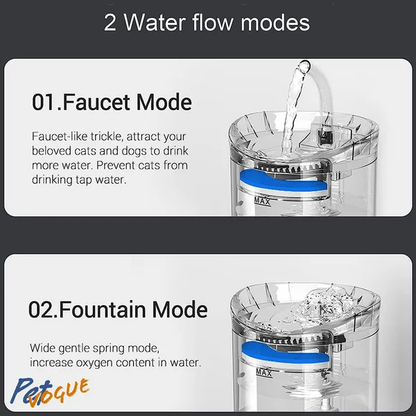 ENCOURAGE WATER DRINKING: We at PetVogue has observed that dynamic water flow helps to attract pets to drink, using a circulatory filtration system to aerate the water 360° multi-directional flow, increasing oxygen and freshnes. Prevent your pet from developing urinary and kidney disease by attracting pets to drink water. This cat water dispenser is equipped with 2 modes of tap and fountain. Free-falling streams and bubble fountains will attract curious pets to find out.