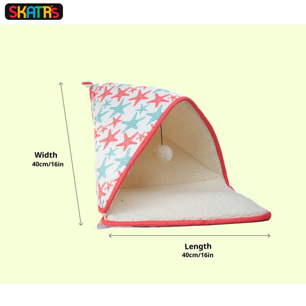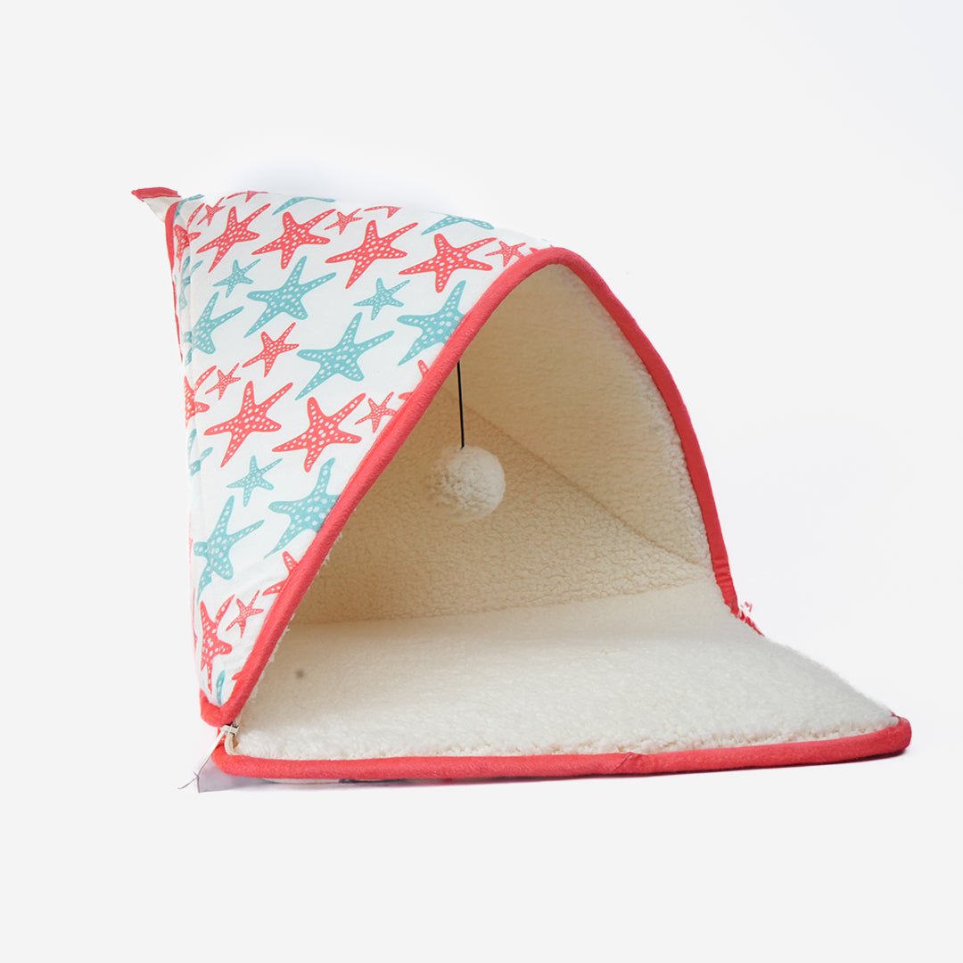 Bring a pop of playfulness home with the Cozy Tent for Cats, Kittens and Small Dogs (Coral Red and Blue). Its vibrant coral red body with starfish prints and soft blue lining makes it a statement piece your pet will adore. Designed with a foldable zip mechanism, it’s easy to pack, store, or take along wherever your pet goes. Perfect for tiny adventurers who love both comfort and fun! Key Features: Foldable Zip Design: Quick to set up, fold down, and carry — perfect for travel or compact storage. Cozy Comfort: Plush inner lining creates a soft, inviting space for naps or relaxation. Playful Add-On: Comes with a pompom toy for hours of gentle fun. Durable Build: High-quality stitching and strong fabric for lasting use. Vibrant Look: Coral red with a starfish print and blue accents add a cheerful touch to your décor. Washable Fabric: Easy to clean and maintain — stays fresh, use after use. Size: 40x40cm .tg {border-collapse:collapse;border-spacing:0;} .tg td{border-color:black;border-style:solid;border-width:1px;font-family:Arial, sans-serif;font-size:14px; overflow:hidden;padding:10px 5px;word-break:normal;} .tg th{border-color:black;border-style:solid;border-width:1px;font-family:Arial, sans-serif;font-size:14px; font-weight:normal;overflow:hidden;padding:10px 5px;word-break:normal;} .tg .tg-baqh{text-align:center;vertical-align:top} .tg .tg-amwm{font-weight:bold;text-align:center;vertical-align:top}